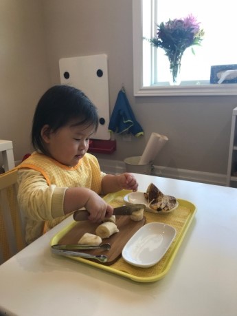 - a variety of food preparation trays such as pulling grapes from the vine, peeling a banana, spreading crackers and peeling cucumbers