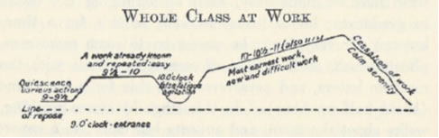 The notion of the three hour uninterrupted work cycle was documented by Maria Montessori, after observing individual children and groups of children. This was the case with her discoveries of the children's developmental nature; she did not begin with presumptions, but instead observed, documented and proposed ideas based on this scientific method. After charting many work cycles of individual children and groups of children, she proposed the following graph of a three-hour work cycle as being typical: