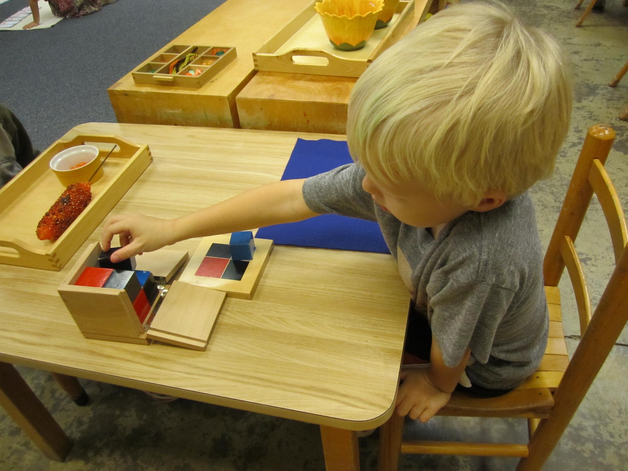 Materials must be in excellent repair and must be accessible to the children. When they are beautifully maintained and complete, they attract the child and allow him to work fully. "All the apparatus must be meticulously in order, beautiful and shiny, in perfect condition. Nothing must be missing, so that to the child it always seems new, complete and ready for use." (Maria Montessori, The Child, Society and the World) In a Montessori classroom, the materials are teachers, too. The materials represent concepts and it is through the child's exploration with the material, that he develops understanding and abstraction of these concepts. Many of the materials contain a "control of error" which acts as a guide and allows the child to self-correct as he works.