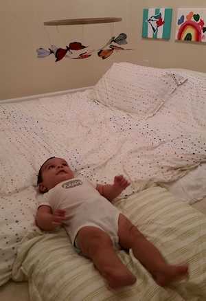 You might consider offering a black and white mobile for them to look at whilst they are on a movement mat on the floor.
